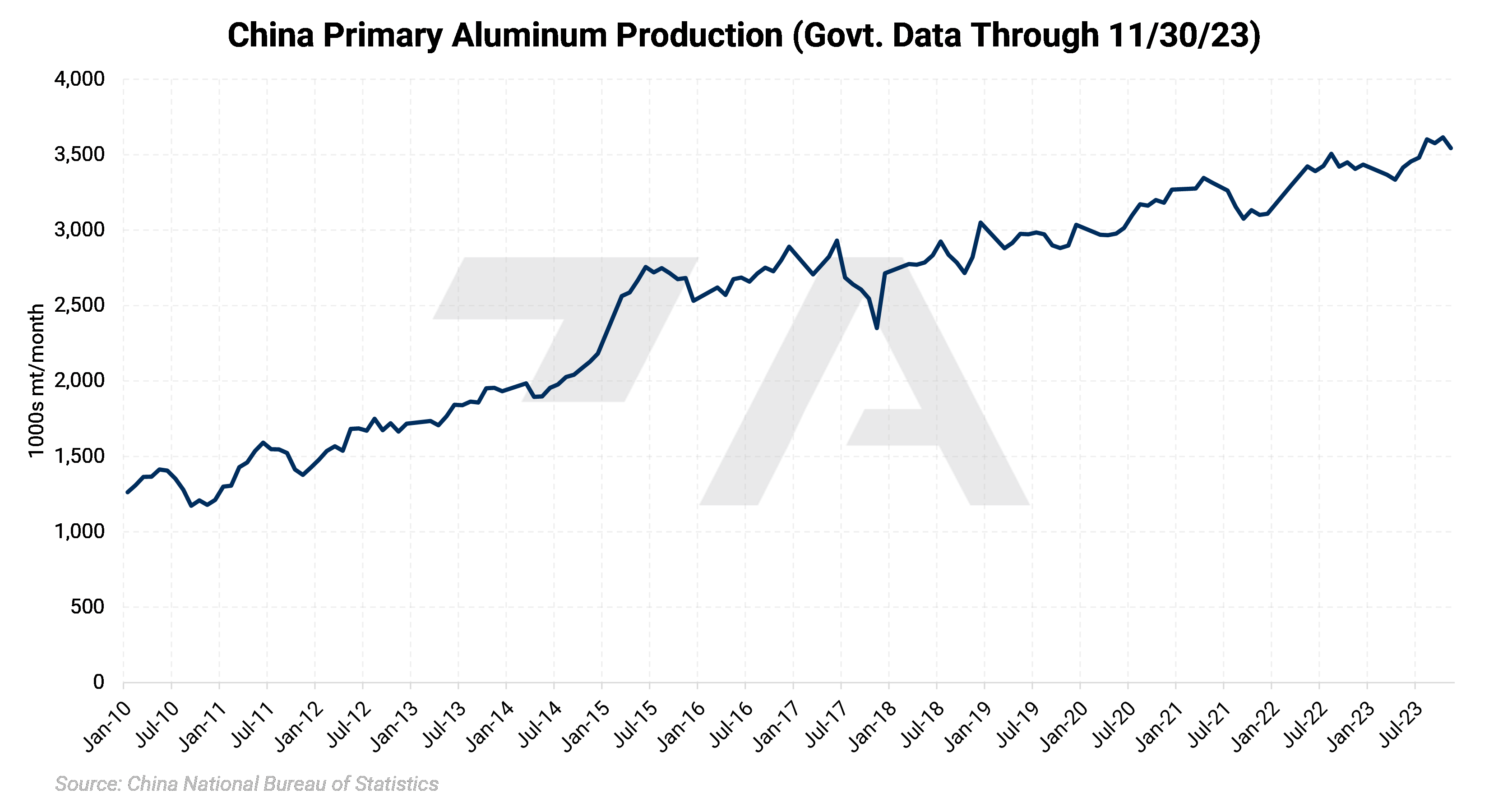 Aluminum production surges in 2023.In 2023, LME Aluminum finished essentially unchanged on the year despite soaring Chinese production amid tepid demand. As the chart below shows, China’s monthly production hit new all-time highs on several occasions this past year despite production issues in the country’s top production region, Yunnan province. So long as China’s smelters keep this brisk pace and demand doesn’t materially grow, we think that aluminum prices will likely remain rangebound in 2024. |